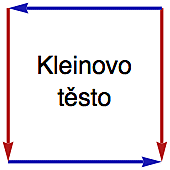 Při výrobě Kleinovy lahve slepíme naopak nejprve strany červené (což je jednodušší, protože ty nemusíme kvůli tomu opačnému směru překrucovat), takže dostaneme malý válec a ten opět trochu protáhneme. Když takto vzniklou rouru vezmeme do rukou, držíme vlastně hadici od vysavače. A teď se pokusíme slepit ty modré hrany (ze kterých se mezitím staly koncové kružnice válce). Nejpřirozenější by bylo oba konce té hadice prostě přiložit k sobě a slepit je (tímto bychom de facto dostali torus). Jenže těsně před tím než k sobě oba konce přiložíme, tak si všimneme, že ty šipčičky, které nám ukazují jak je slepit, jdou opačným směrem.
