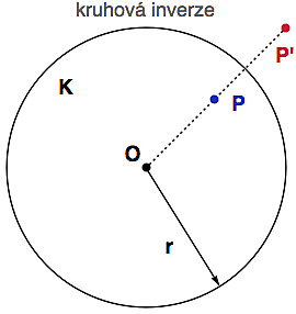 Vezmeme si kružnici K (budeme jí říkat řídící kružnice) se středem v bodě O a s poloměrem r a pro každý bod P v rovině definujeme jeho obraz (kruhovou inverzi I) jako bod P', který leží na stejném středovém paprsku (polopřímce) OP a jeho vzdálenost od středu O splňuje rovnici