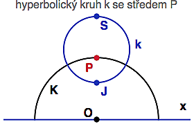 I zde se dá ověřit, že ze středu P je to k obvodu každé bledě modré kružnice skutečně stejně daleko (v hyperbolickém smyslu), ale výpočet je podstatně zapařenější (kruhový model má komplikovanější metriku).