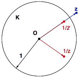 Číslo z si opět zapíšeme v polárním tvaru z= r exp(it) a dostaneme 1/z = (1/r) exp(-it). Polární souřadnice r se tedy změnila na svou reciprokou hodnotu (inverze vzhledem k násobení), zatímco souřadnice t (úhel) se změnila na svou opačnou hodnotu (inverze vzhledem ke sčítání). Aby toho nebylo moc najednou, podívejme se nejprve na komplexní číslo 1/zŻ = (1/r) exp(it). Toto číslo je kruhovou inverzí čísla z vzhledem k jednotkové kružnici K se středem v 0: leží na stejném paprsku a součin jejich vzdáleností od středu je čtverec poloměru: r(1/r)=12, což je rovnice (+) z úvodu. Hledané číslo 1/z je pak evidentně číslem komplexně sdruženým k 1/zŻ (de facto zrcadlení v ose x).