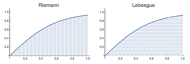 Lebesgueova integrace (vpravo) tu plochu také nařeže na nudličky, ale tentokrát horizontální. Nekrájíme tedy definiční obor (proměnné x), ale obor funkčních hodnot (proměnné y). Pro danou hodnotu y je délka každé nudličky zhruba určena velikostí (mírou) množiny, na které funkce nabývá danou hodnotu (nebo vyšší). Celkovou plochu pak opět dostaneme sečtením všech nudliček. Pro Lebesgueův integrál je tedy v první řadě nutné, aby na prostoru, kde integrujeme existovala míra. Pokud se vám podaří míru zadefinovat na prostoru pingpongových míčků, můžete na něm zfleku začít integrovat.