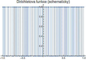 Položme si teď otázku, jaká bude pravděpodobnost, že z jednotkového intervalu si náhodně vyberete číslo racionální. Tady bychom potřebovali integrovat indikátorovou funkci racionálních čísel (což je Dirichletova funkce na dalším obrázku vpravo).