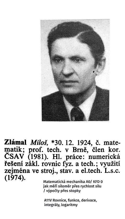 Miloš Zlámal *30.12.1924, český matematik; profesor techniky v Brně, člen korespondent ČSAV (1981). Hlavní práce: numerická řešení základních rovnic v matematice fyzice a technice; využití zejména ve strojírenství, stavebnictví a elektrotechnice.