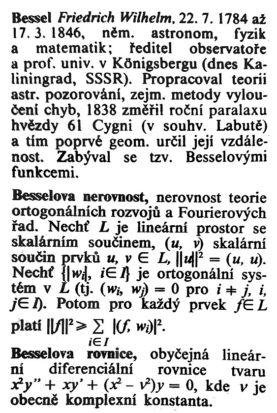 Willhelm Friedrich Bessel 1784-1848, německý astronom, fyzik a matematik; ředitel observatoře a univerzity v Königsbergu (dnes Kalingrad, Rusko). Propracoval teorii astronomických pozorování, zejména metody vyloučení chyb, 1838 se zaměřil na roční paralaxu hvězdy 61 Cygni (v souhvězdí Labutě) a tím porvé orčil její vzdálenost. Zabýval se tzv. Besselovými funkcemi.
