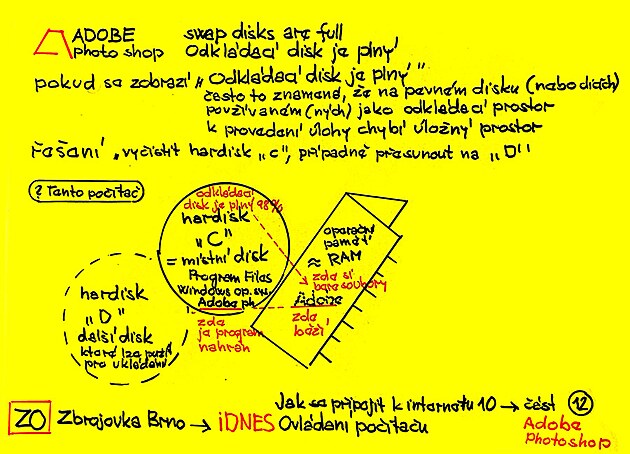 Pokud se zobrazí „odklídací disk je plný – swap disk are full“ často to znamená, že na pevném disku, nebo discích dochází úložný prostor. Mimochodem, sídlem programu Adobe photoshop je sice hardisk C – ale program funguje na operační paměti – dříve zvané RAM.