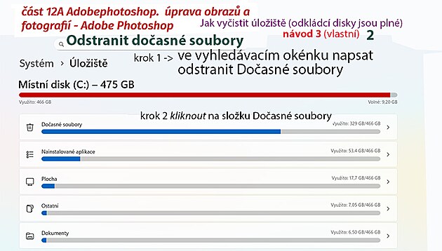 Mohou být použity dvě metody zároveň – jedna zdlouhavá (tedy zadat pokyn „vyčistit Dočasné soubory“) – a současně je ovšem možno složku Dočasné soubory rozkliknou – a zde se například objeví složka Koš kterou je možno vprázdnit – čímž by se už mělo uvolnit místo na oskládacích discích. Do koše je možno přesouvat další nepotřebné sobory a Koš znovu vyprazdňovat.