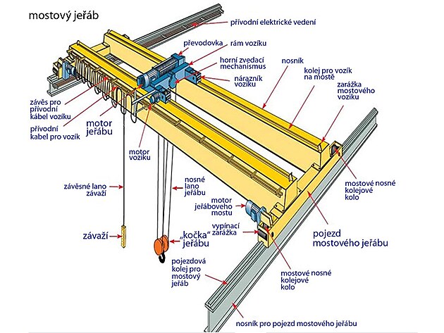 Mostový jeřáb je definován jako zdvihací zařízení určené ke zvedání a přemisťování břemen ve výrobních halách, překladištích apod. Hlavní části mostového jeřábu je jeřábový most s pojezdovými příčníky a kočka se zdvihadlem, lanem a kladnicí s hákem. Snad ještě k motorům - u mostových jeřábů se uplatňují tři elektromotory - jeden pro pohyb jeřábového mostu, další elekromotor pro pohyb jeřábového vozíku po jeřábovém mostě a třetí s manipulací s břemenem - tedy zdvih kočky jeřábové kočky s hákem.
