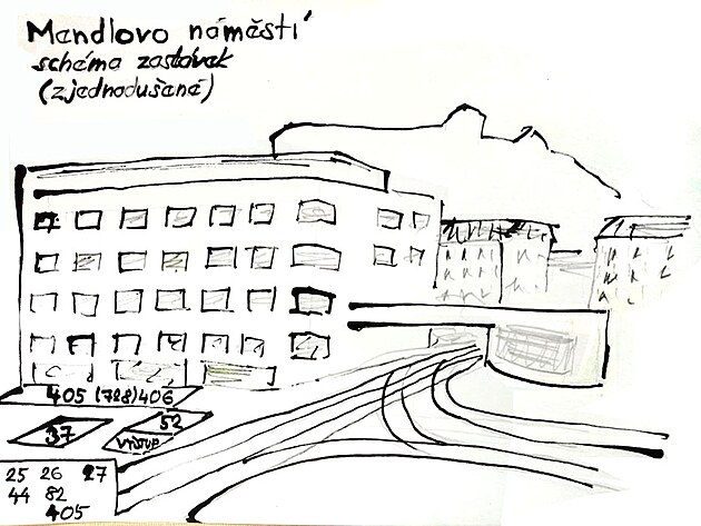 5/ ZASTÁVKY a malé kovové stavby, stará konečná „devítky“ Černá pole – Lesnická – tramvaj T2
