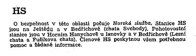 O bezpečnost v horské oblasti pečuje Horská služba. Stanice HS jsou na Ještědu a v Bedřichově (chata Svobody – nyní pravděpodobně chata Tříska – ubytování GPS 50.7821472N, 15.1636311E). Pohotovostní stanice jsou v Horním Hanychově a v Bedřichově (Lesní chata a Fučíkova chata). Členové HS poskytnou všem potřebnou pomoc a žádané informace (text průvodce asi z roku 1980).