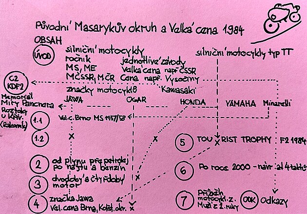 Autorského čtení... Poněkud nečekaně se objevila v jedné kapitole tématika motocyklových závodů v Brně. V Bystrci dokonce jedna místní hospoda měla fungovat jako dostaveníčko motorkářů – čemuž ostatně výzdoba interiéru nijak zásadně nenasvědčovala. Také původní kniha obsahuje daleko více informací v textu než zde předložený zápisek.