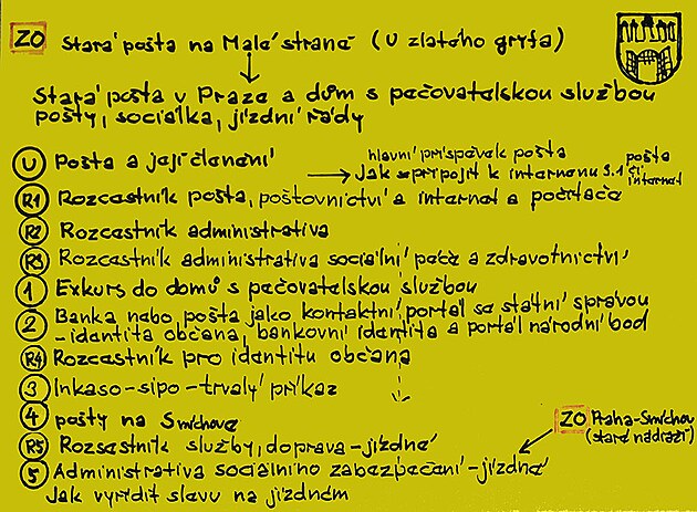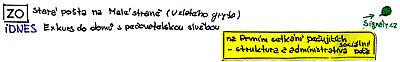 Stará pošta v Praze a dům s pečovatelskou službou- rozcestník pošty, sociálka, jízdné