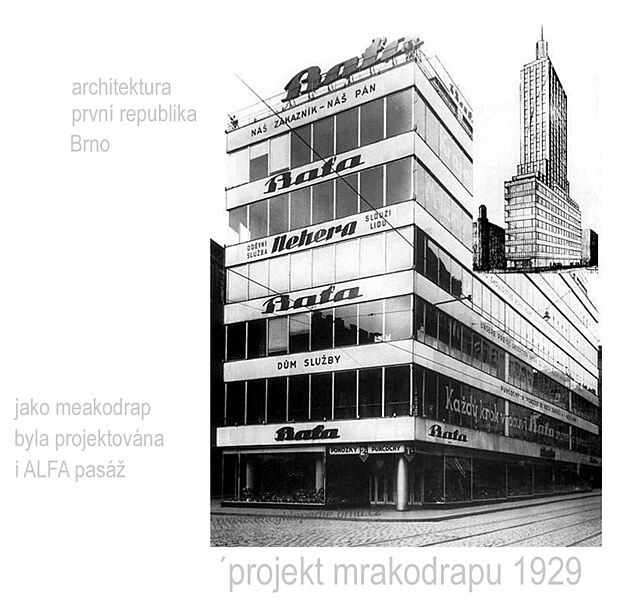 V polovině dvacátých let dosáhla obuvnická firma Tomáše Bati již takové prosperity, že se rozhodla pro stavbu sítě velkých obchodních domů po celém Československu. V Brně byla zakoupena parcela mezi ulicemi Jánská a Kobližná přímo v centru města, kde na místě historických nízkopodlažních staveb měl vzniknout první evropský mrakodrap. Po nevydařené vyzvané soutěži a dalších průtazích s výběrem vhodného návrhu oslovil Tomáš Baťa architekta Vladimíra Karfíka, který mohl zúročit svoje zkušenosti z ateliéru amerického architekta Franka Lloyda Wrighta a navrhl konečnou podobu stavby. Ta měla být tvořena podélnou horizontálně členěnou hmotou obchodního domu a štíhlou věží administrativního zázemí. Stavba značně propagované a veřejností očekávané nejvyšší budovy v Evropě byla započata v roce 1930. Aby Baťův plánovaný Dům služeb o dvaceti třech podlažích mohl vůbec vzniknout, bylo potřeba věnovat velkou pozornost základům v ne příliš ideálním podloží této části Brna, které byly tvořené rámovou konstrukcí na 245 desetimetrových pilotách. Přesto nastaly v průběhu stavby problémy se spodní vodou a také s požadavky stavebního úřadu, jenž našel nedostatky v armatuře nosných sloupů budovy. Stavba tak musela být zastavena již v osmém podlaží a z plánovaného mrakodrapu tak stala výšková stavba - která i tak do značné míry inovovala architektonickou tvářnost města Brna.