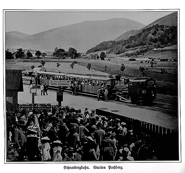 Ve druhé polovině 19. století se horská turistika stala módou. První horské chaty v regionu Schneeberg měly již v té době kolem 10 000 návštěvníků ročně. Zřejmým krokem byla Stavba ozubnicové železnice byla tedy logickým krokem. Již v roce 1872 se objevily první plány na stavbu ozubnicové dráhy na Schneeberg. V roce 1885 obdržel vídeňský inženýr Josef Tauber předběžnou koncesi na železniční trať z Vídně. Neustadt do Puchberg am Schneeberg a dokázal získat starostu Wiener Neustadt Carla Haberla jako podporovatele projektu. Na základě koncesní listiny z 25. září 1895 pro místní dráhu z Wiener-Neustadt do Schneebergu s odbočkou do Wöllersdorfu (Schneebergbahn) byla 9. prosince 1895 zahájena stavba nádraží v Puchbergu pod vedením vídeňského inženýra Lea Arnoldiho . První úsek tratě do Baumgartneru byl otevřen 1. června 1897, zbývající úsek do Hochschneebergu 25. září 1897.