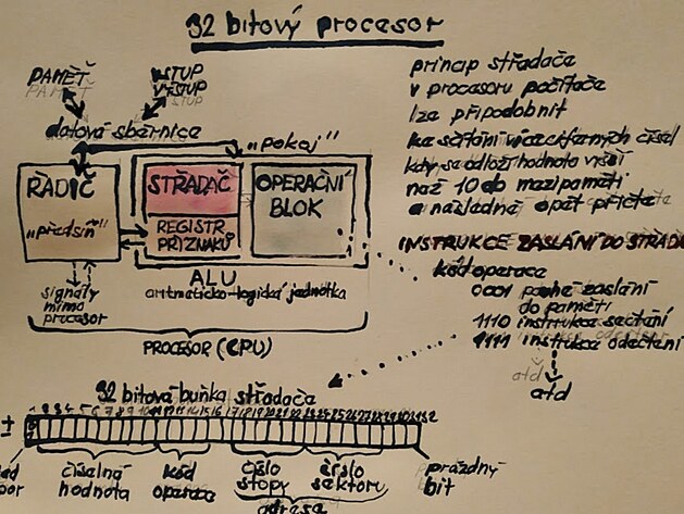Pokud se například sčítají víceciferná čísla, tak se ukládají do cifry vyšší než deset do jakési mezipaměti. A na podobném principu u počítače pracuje i střadač - kde se ukládají různé přebytky, se kterými si operační blok nedokáže poradit. Pro tento účel jsou ve střadači vyhrazeny buňky o 32 bitech. První buňka rozhoduje zda budou následovat kladná, či záporná čísla, přičemž nula znamená nezáporná čísla, jednička záporná... Dále je vyhrazeno devět bitů pro vlastní číselnou hodnotu. Čtyři buňky kódují vlastní matematickou operaci - například 1110 znamená sčítání, obdobně je kódováno odečítání a další operace. Určitý počet bitů slouží jako adresář ve střadači - a poslední - dvatřicátý bit zůstává prázdný.