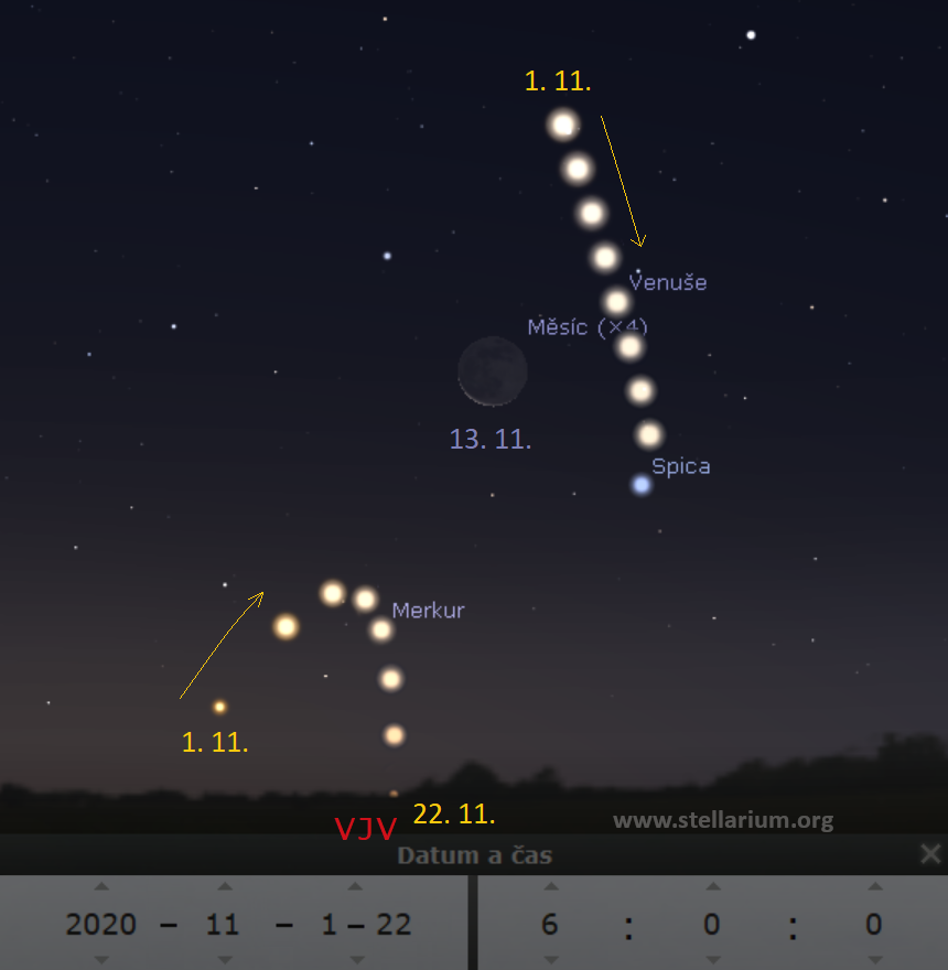 1. - 22. 11. 2020 - Merkur, Venuše, Měsíc a Spica na ranní obloze.