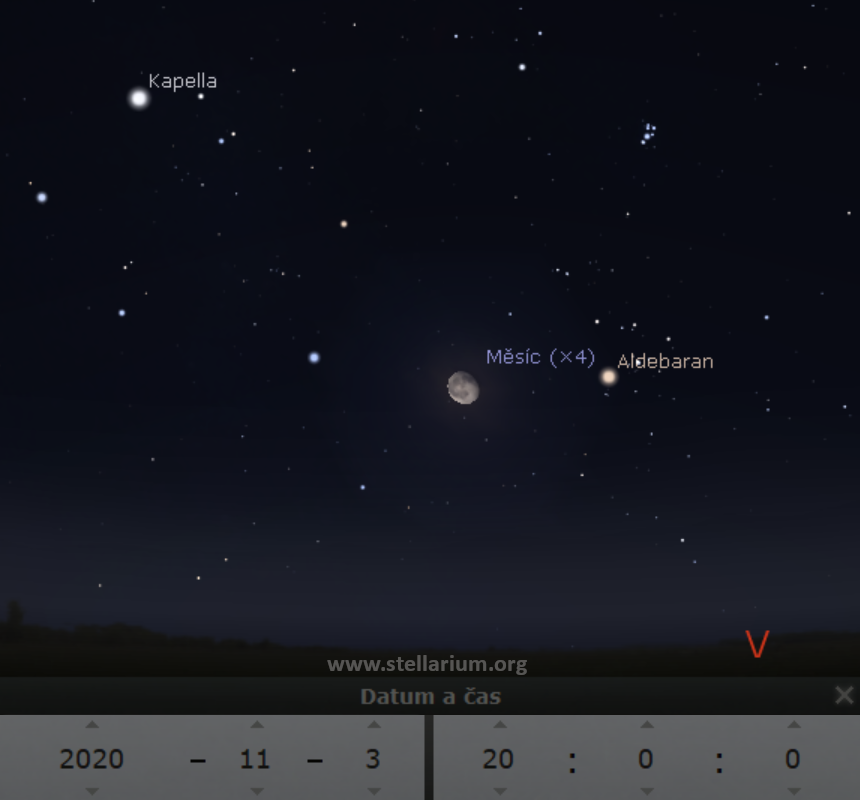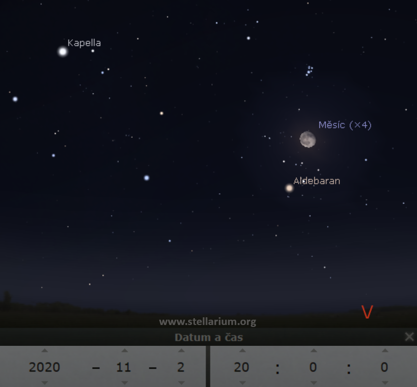 2. 11. 2020 - Měsíc mezi Plejádami a Aldebaranem v souhvězdí Býka.