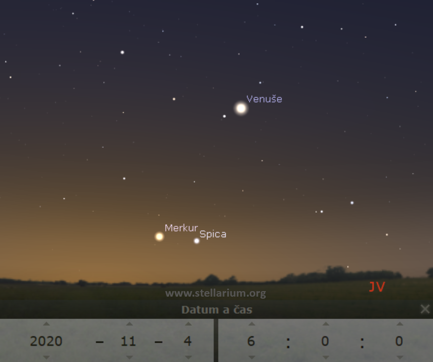 4. 11. 2020 - Merkur v konjunkci s hvězdou Spikou spolu s Jitřenkou na ranní obloze.