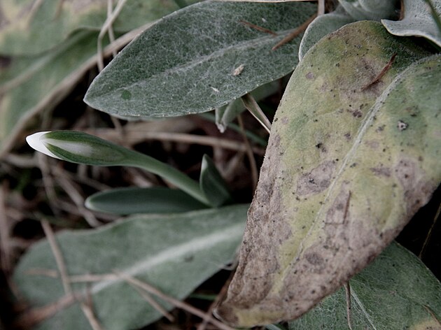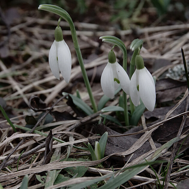 Jako purpurový plášť archanděla rozstříhaný na kousky, tak vypadají koniklece vykukující zpoza staré trávy....
