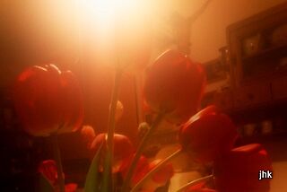A na jídelním stole stojí váza s červenými tulipány.