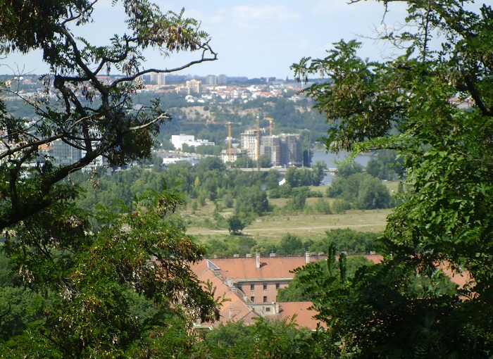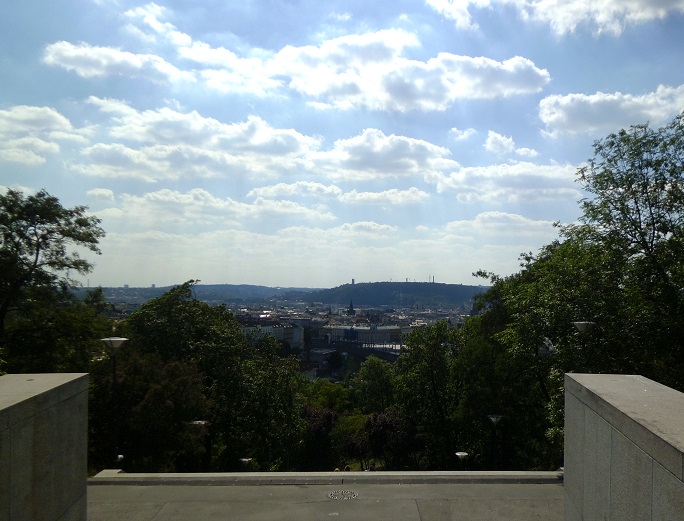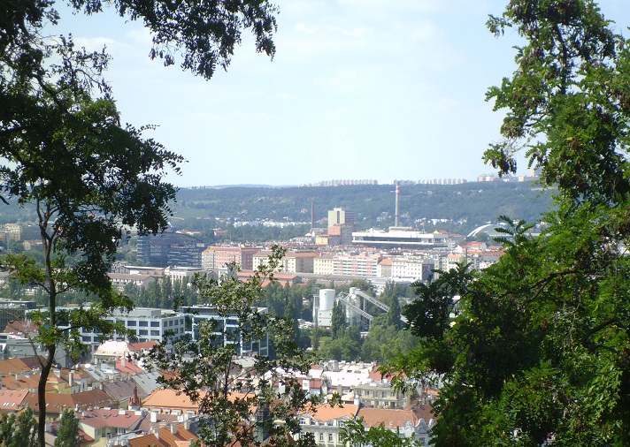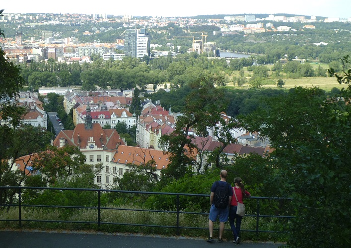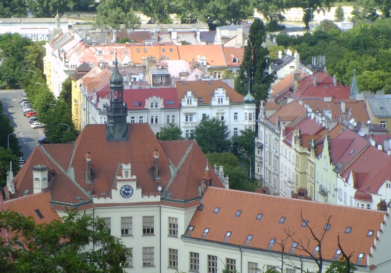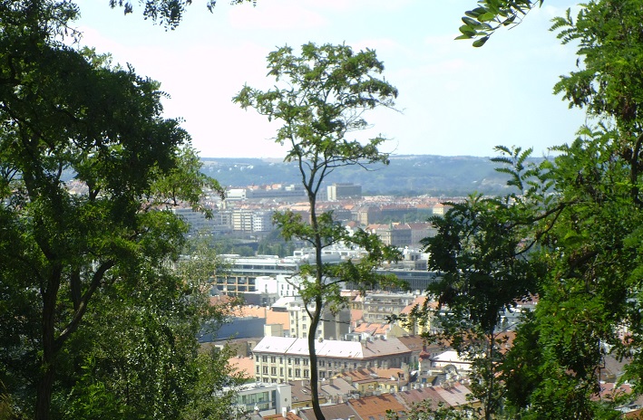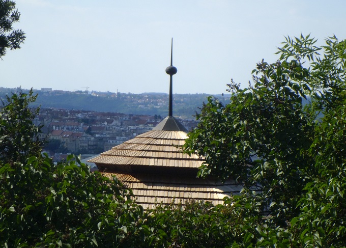 Pohled na Prahu s věžičkou na zlatavé střeše.