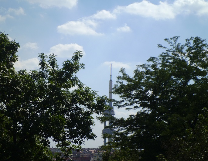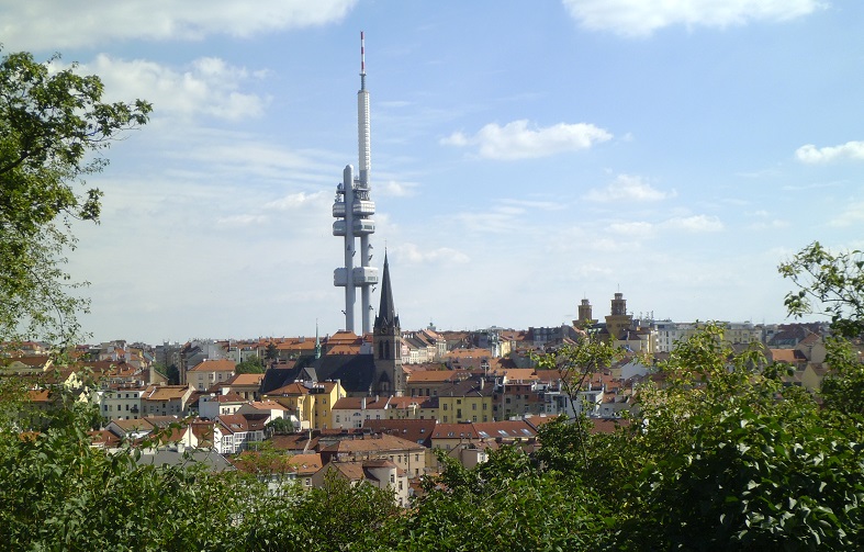 Žižkovská televizní věž, která je tak šeredná, až je krásná a v popředí se krčí věž kostela Sv. Prokopa na Žižkově.