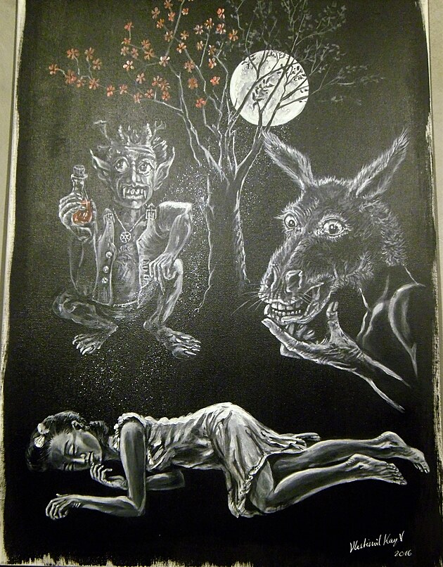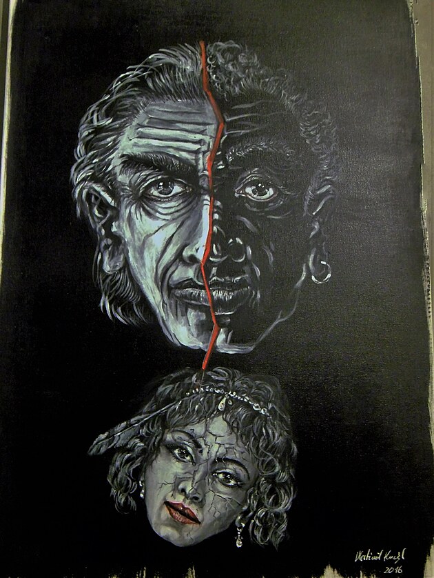 Můj bratr Vlastimil Kvapil je hlavně fotograf, ale už skoro dvacet let také malíř. Jeho oleje se mi vždycky líbily, ale že se pustí do obrazů na motivy Shakespearových her, to by mě nikdy nenapadlo. Jak k tomu došlo, přibližuje sám: „Výstava k výročí 400 let od úmrtí Williama Shakespeara vznikla částečně na popud Milana Chrdleho z Dejvického divadla v Zelené ulici, který byl na vernisáži mé poslední výstavy a vystavené věci se mu tak líbily, že mi navrhl, abych nějakou podobnou, tématicky zaměřenou výstavu vytvořil i pro prostor Anti.kvariát, který je součástí Dejvické divadelní kavárny. Ani nevím, jak mě vlastně napadlo namalovat postavy z her Williama Shakespeara. Nejspíš to bylo tím, že jsem v Dejvickém divadle viděl adaptaci pro mě dosud neznámé Shakespearovy hry Zimní pohádka, navíc všude se mluvilo o výročí jeho úmrtí a asi nejvíc to umocnila návštěva dvou divadelních představení, či spíš přednášek profesora Martina Hilského o díle Williama Shakespeara v Dejvickém divadle.