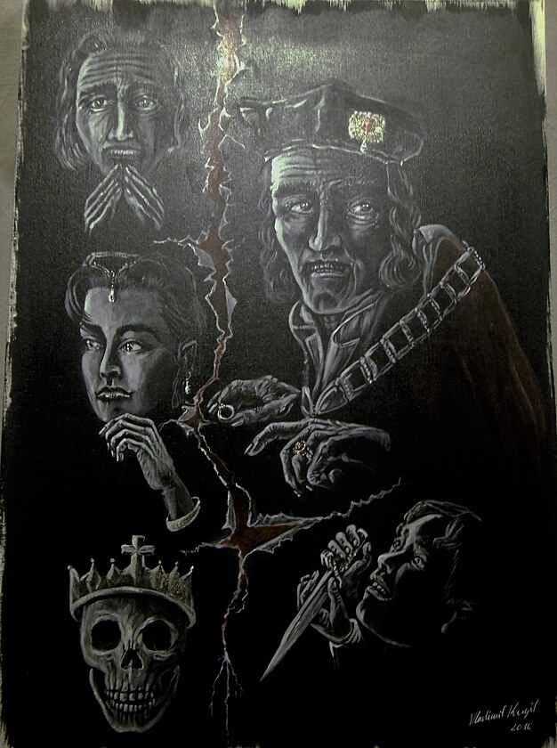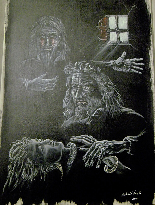 Bylo to tak fascinující vyprávění, že už v divadle se mi vybavovaly obrazy jednotlivých postav z jeho známých her, ale díky panu profesorovi i těch méně známých. Na základě toho jedinečného zážitku jsem se o dílo W. S. začal podrobněji zajímat. Nakoupil jsem knihy, stahoval rozhlasová provedení divadelních her, filmy, záznamy divadelních představení, projížděl internet a úplně mě to pohltilo. Ve svých osmapadesáti letech jsem zjistil, jak jsou ty hry neuvěřitelně nadčasové, chytré, poučné, komické i tragické, napínavé i dojemné. Kolik je v nich poznání, zkušeností, ale i znalostí historie, lidských povah i osudů a jaké pro nás představují morální poselství. A bylo rozhodnuto, už to nešlo zastavit. Nevím, jak dalece se mi můj záměr – předat poselství W. S. dál jen formou bíle naznačených postav nebo spíš jejich torz a detailů na černém pozadí – povedl. Ale ta práce byla krásná, mnohé jsem se naučil, pochopil a hlavně – objevil jsem pro sebe geniálního Williama Shakespeara. A to není málo.“