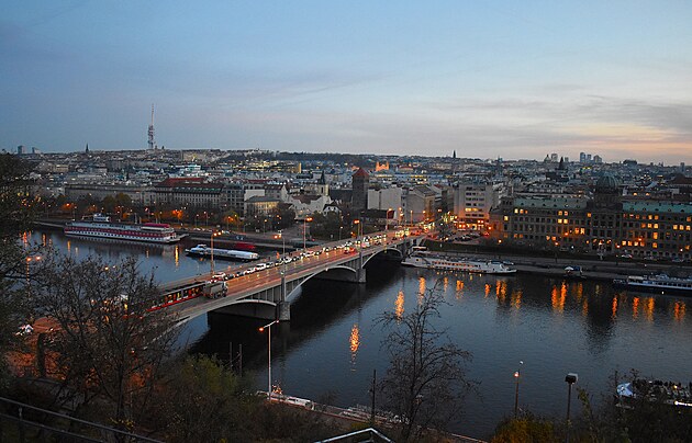 Pohled proti proudu Vltavy směrem k Čechovu mostu, v pozadí Petřín