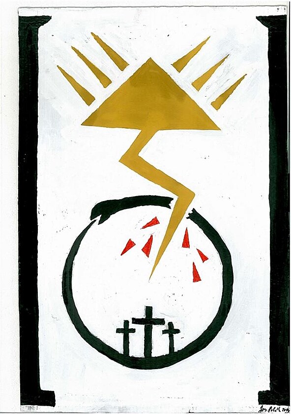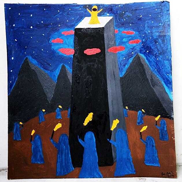 Vydržel jsem to tak dalších 14 dní a bylo mi hůř a hůř, terapeutický režim zjevně nezabíral a jediné, co mě těšilo, byla práce v dílně – z kreativní jsem přešel do výtvarné a začal malovat. Malování mi dělalo dobře a umožňovalo mi vyjádřit bolest, kterou jsem prožíval. Ve výtvarné dílně se střídaly dvě zdravotní sestry – jedna z nich, mladé děvče, tam mívala své canisterapeutické fenky (pitbula a čivavu!), což bylo fajn a vždy jsem jim věnoval část svého času, zvláště té pitbulce, v níž se úžasně snoubila tělesná síla s laskavostí, nicméně pokud jde o práci s pacienty, neuměla je opravdu dobře motivovat a povzbudit k práci, druhá, věkem po třicítce, tam byla jen občas, vždy nekompromisně vypínala rádio a pouštěla jazz a skutečně se pacientům na úrovni věnovala, což na mě vždy zanechalo hluboký dojem. Škoda, že tam nebývala častěji. Malování mě chytlo natolik, že jsem si nakonec koupil anilinky, štětce a skicáky a občas jsem si maloval i sám na pokoji. Přestože nemám žádné malířské ambice, rozhodl jsem se v tomto článku podělit o svou tehdejší tvorbu. Berte ta dílka prosím s rezervou, tvořil jsem je hlavně pro sebe a sem je dávám hlavně pro dokreslení atmosféry.