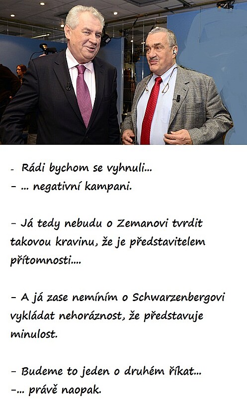 "Je potřeba si uvědomit, že jeden z nás bude hlavou státu a nebylo by hezké, kdyby měl vítěz při vstupu na Hrad oblek samou kaňku od rajčat a vajíček, které na něj házel jeho oponent.“