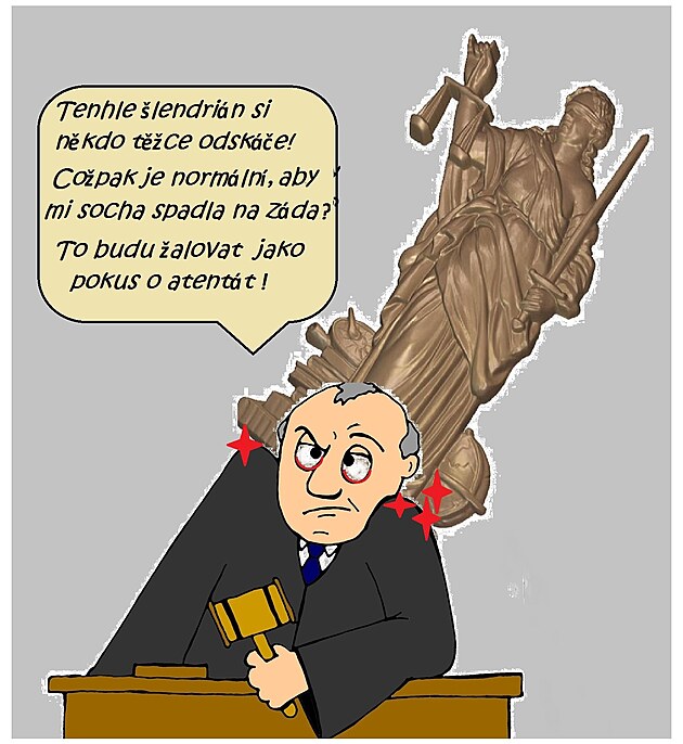 Na záda mu sice nehupsla drobná půlmetráková aktivistka, která zapříčinila úraz ramene onomu "rameni spravedlnosti", ale Jeho ctihodnosti přistála za krkem soška symbolizující justici, kterou někdo nedbale připevnil ke stropu, když se v soudní síni malovalo.