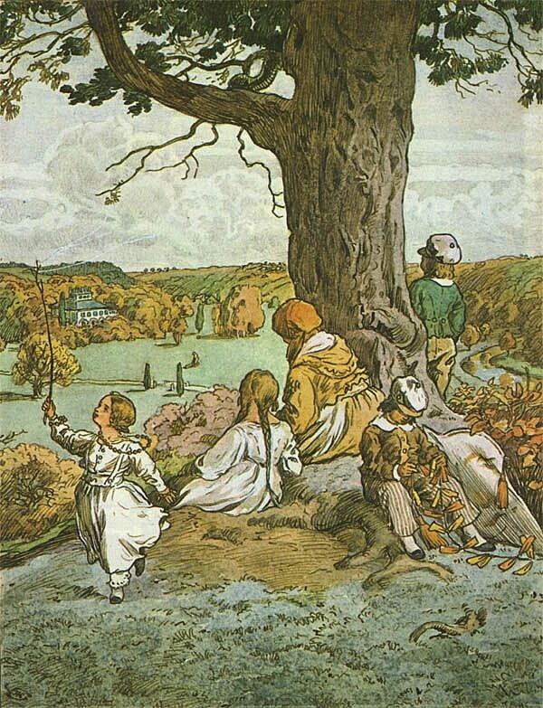 Takto vypadá původní ilustrace malíře Adolfa Kašpara citovaná ze zdroje wikipedia. Zachycuje Barunku a sourozence v bezprostřední blízkosti babičky.