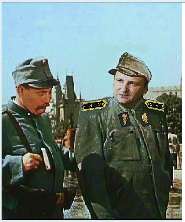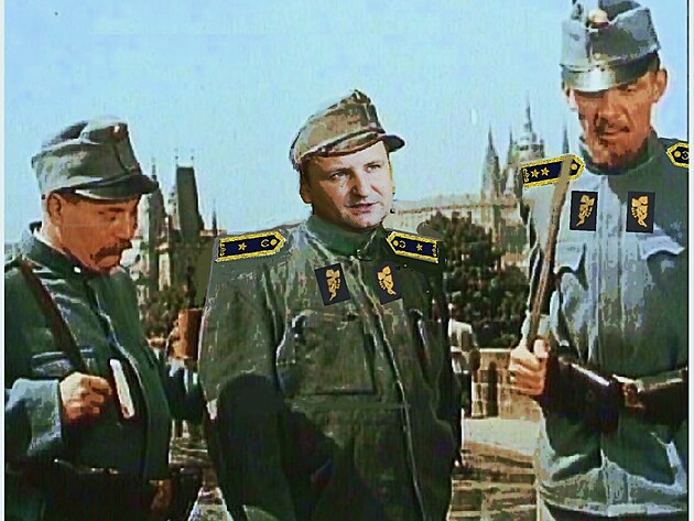 -Promiňte, pane kolego, ale vy jste si asi zapomněl všimnout, že tady Venca je dokonce o šarži výš, než vy. Pan prezident mu kvůli vašemu převozu do Olomouce dočasně, na přání pana Babiše, aby všechno proběhlo v ažůru, propůjčil šarži generálmajora.
