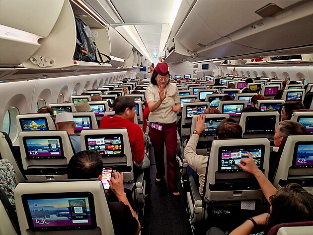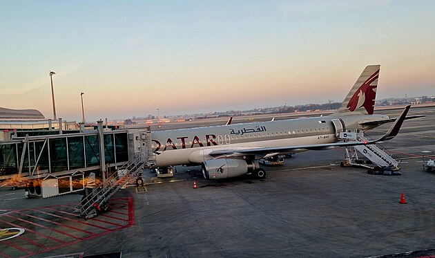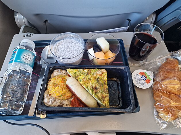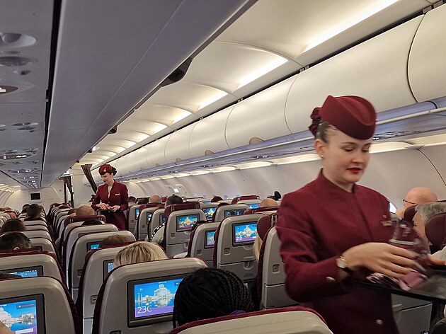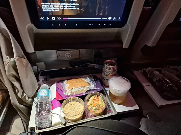do provizorního salónku, protože ty stávající prostory byly rekonstruovány. To však ničemu a nikomu nevadilo. I v náhradních prostorách byla snídaně dobrá. Let QR290 společnosti Qatar Airways byl operován letounem Airbus A320. Co přesně jsme jedli a pili během letu si už nepamatuji, ale bylo toho dost a nebylo to vůbec špatné. Prostě jiný level než Smartwings nebo Ryanair. Kromě nealkoholických nápojů jsme si mohli dát i pivo, víno nebo třeba whisky.