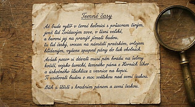 Až bude rytíř v černé helmici s průzorem čirým, jenž lid Zvídavým zove, v tísni veliké, a baroni jej na pranýř jímati budou, tu lid český, srocen na náměstí pražském, orlojem hlídaným, vyžene zpupné pány do luk okolních.