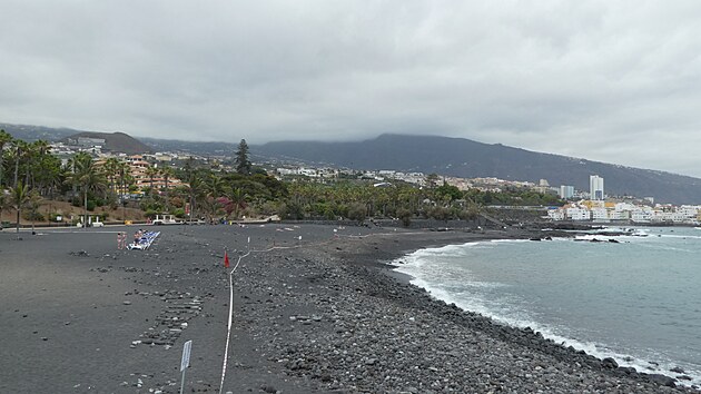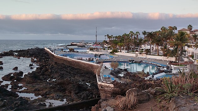 Kamenitá pláž Martiánez a vpravo bazénový komplex Martiánez.