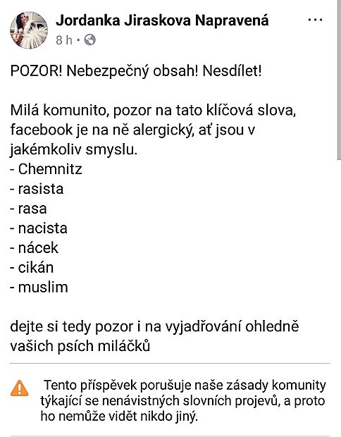 Nyní je to už asi pátá pomýlená blokace, kterou od facebooku mám, takže už jsem si zvykla, dneska jsem ale potkala dávnou kamarádku ze základky. Chvilku jsme pokecaly, ale nebylo moc času a tak při rozloučení říká, „najdu si tě na facebooku a napíšu přes messenger“ a já musela odpovědět, „to asi nepůjde, mám teď 30 dní blokaci za rasismus“.