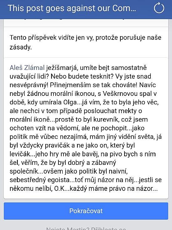 Dalo by se při velmi dobré vůli pochopit, že chce facebook omezit jakékoliv urážení uživatelů a nemá kapacitu na luštění smyslů slov, v jakých byly použity. Co ale nechápu, jsou opravdu absurdní blokace za čisté vyjádření názoru. Přičemž ve většině případů jde o „špatné“ názory, proti levicové politice. Tedy proti politice facebooku. Jen pár hodin přede mnou totiž dostal 30 denní ban můj kamarád za to, že napsal: " Havel byl kurevník ......a levičák, jeho hry mě ale bavěj a na pivo bych s ním šel"