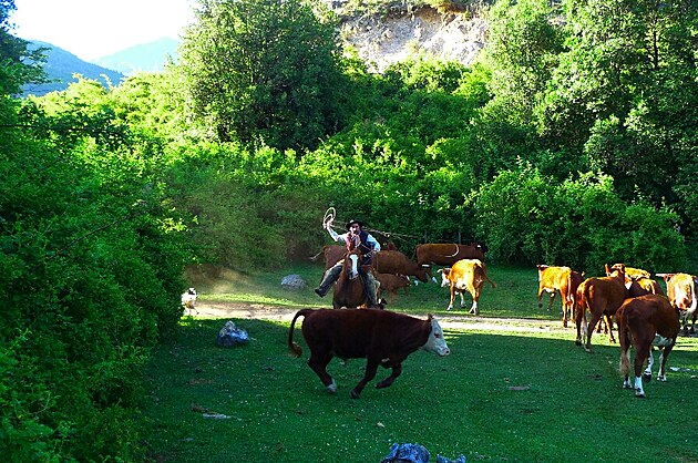 Když sem viděl zblízka, kterak jsou čtyři chlapi totálně ufunění z boje s krávou a ta má pořád převahu, nepochopil jsem, k čemu budu dobrý. Jitka na mne koulela okem velkým jako moje hlava a dávala mi najevo "chytni na mě a sežeru tě i jako bíložravec"! Pepe mi dál úkol, abych ji zvedl hlavu za uši a snažil se ji nasoukat na korbu auta. Božeeee, jaaaaak! Všichni byli od kravích hoven až za ušima, všichni funěli, já tlačil Jitčinu hlavu na korbu a permanentně jsem ji vysvětloval, že jsem v tom nevinně a že jsem tu jen na návštěvě.. Pro Jitku vše marně. Člověk opět zvítězil. Kupci odjeli, Pepe si zapálil cigáro a na pět metrů přesně trefil lasem svého psa, který mi čichal k brašně s jídlem.. Ukázal jsem za odjíždějící Jitkou, tázajíc se Pepeho "churrasco"? Neboli steak? Což ostatní opravdu rozesmálo a plácali mne po zádech kývajíc hlavama, že ano. Joooo Jituš, život je takovej a jinej nebude. Třeba se ještě potkáme... na talíři!