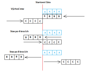 Na vzniklém schématu je na první pohled patrné, že se jedná o stejnou situaci jako na obrázku předchozím. Rozdíl je jen v tom, že místo matoucího optického dojmu a výrazné informaci o zcela nepodstatném bloku A je zde danému účelu zcela odpovídající informace o startovní čáře. Informace o bloku A v prvním obrázku jednoznačně svádí k nesprávnému závěru, zatímco informace o startovní čáře pak možnost nesprávného závěru zcela vylučuje.