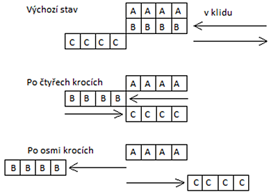 Je to opět důkaz mistrné manipulace s člověkem s využitím neúplné informace a nedokonalosti lidského vnímání a paměti. Přitom stačí velmi málo k tomu, aby byl matoucí význam bloku A stejně jako šipek znázorňujících pohyb bloků B a C pro správné posouzení daného problému odhalen. U jednotlivých obrázků jen snížíme optický vliv bloku A tím, že obrázek doplníme o startovní čáru a šipky ukazující směr pohybu umístíme tak, aby byly ve vztahu k rovině startu ve stejné pozici, a dostaneme toto schéma.
