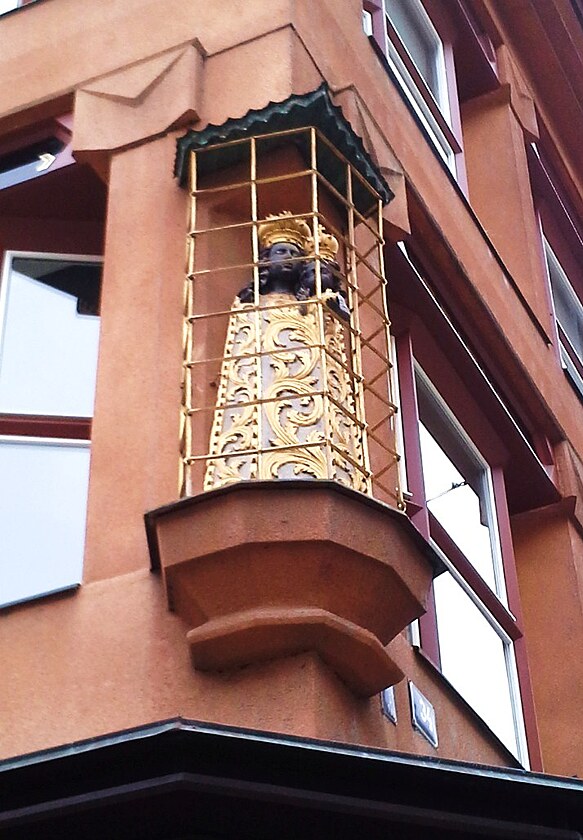 Nakonec magistrát i protestující pražští patrioté kapitulovali před osobitou krásou stavby a přijali dům s obdivem. Jméno dostal po barokní sošce černé madony za zlatou mříží, která byla přenesena z původní zástavby a umístěna na severovýchodní nároží.