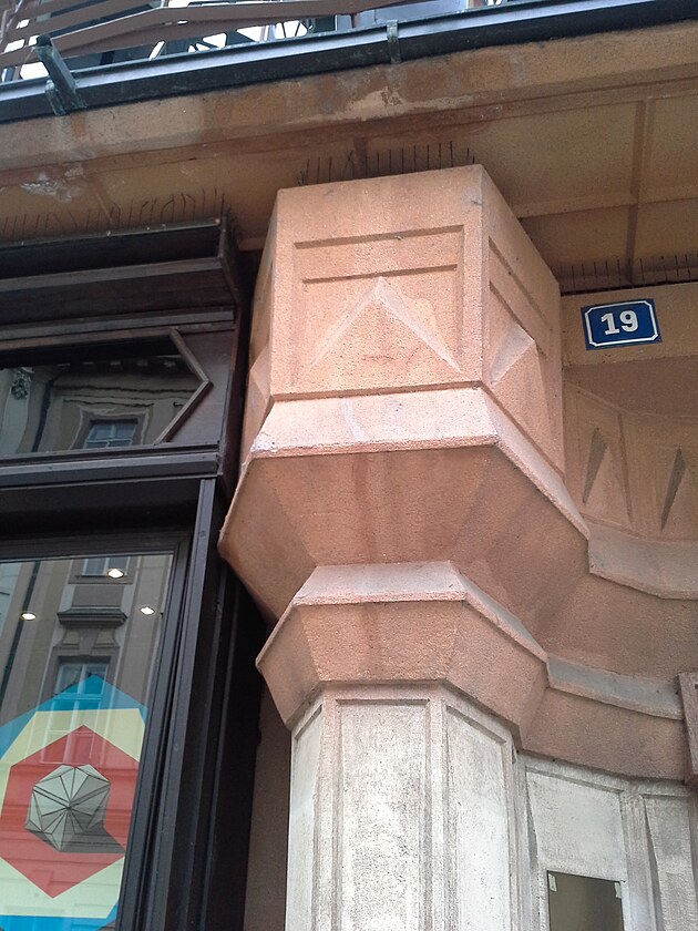 Jdete-li od Prašné Brány na Ovocný trh, tuhle stavbu na rohu Celetné nemůžete minout bez povšimnutí. Lomené průčelí, stupňovitě mansardová střecha, kubisticky tvarovaný vchod a balkónové zábradlí, lomená okna – celý ten dům je natolik zvláštní, že stojí za to si ho pořádně prohlédnout, zvenku i zevnitř.