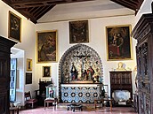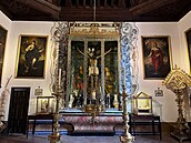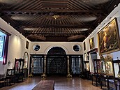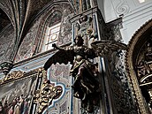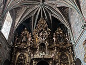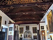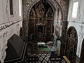 Chor kostela s žebrovím, kalváriemi a obrazy. Krásný strop v mudejarském slohu