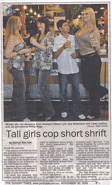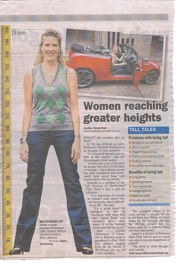 Leden 2011 – Brisbane, australská metropole, v níž jsem v té době žila, byla zasažena vlnami dešťů způsobené tropickým cyklonem "Tasha" ze severozápadu. V té době moje kamarádka ležela v nemocnici, kde čekala, až se doktor bude schopen přes povodňovou situaci dopravit do práce a naplánuje jí termín operace. Přišla jsem ji navštívit zrovna v den, kdy povodně zasáhly centrum města. Já osobně noviny nečtu, avšak k mému štěstí ona ano… Upozornila mě na článek, který jsem si jako jediný po prohlídnutí celých novin přečetla od začátku až do konce. Byl v něm rozhovor s vysokou Kanaďankou o jejích životních zkušenostech. Během čtení toho článku jsem se v jejích slovech nacházela. Připadala jsem si jako kdybych ten rozhovor pro noviny udělala já osobně...natolik mi mluvila z duše. Na konci článku byla velmi důležitá informace – odkaz na webovou stránku klubu vysokých žen v Austrálii "Tall Women's Club" (TWC).
