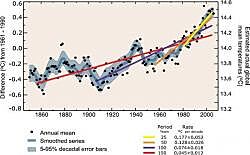 Konkrétně toto tvrzení najdete u grafu č. 1 v části FAQ 3.1 v První pracovní skupině Čtvrté zprávy IPCC 2007. „ Note that for shorter recent periods, the slope is greater, indicating accelerated warming.“ V Technical Summary IPCC navíc píše: „Průměrné tempo oteplování za posledních 50 let (0,13°C ± 0,03°C za desetiletí) je téměř dvojnásobné oproti tempu oteplování za posledních 100 let.“ Tímto údajným zrychlováním se oháněl rád i šéf klimatického panelu pan Pachauri, například ve své přednášce na kodaňské konferenci 2009 (viz zde).
