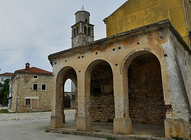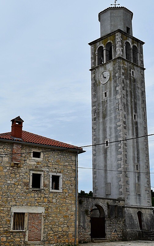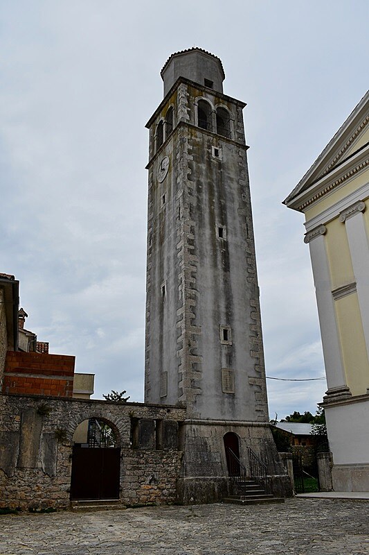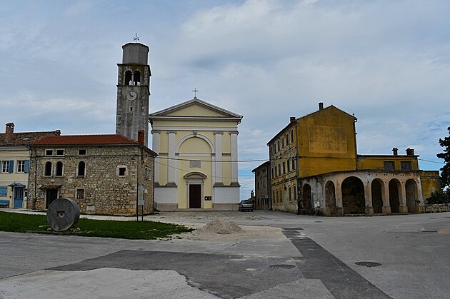 Námestiu dominuje klasicistický kostol sv. Hieronima s vedľa stojacou zvonicou. Tou zvonicou, ktorú sme už z diaľky videli, keď nás lákala. Vraj je to jedna z najstarších zvoníc na Istrii z pred 16. storočia. V jej okolí je lapidárium s rímskymi nápismi, ktoré potvrdzujú prítomnosť rímskych veteránov, ktorí získali tieto pozemky za zásluhy od Caezara. Keď sme prišli za farský kostol, otvoril sa krásny výhľad na nádherné mesto Motovun a údolie rieky Mirna.