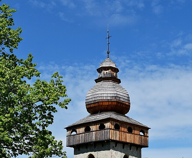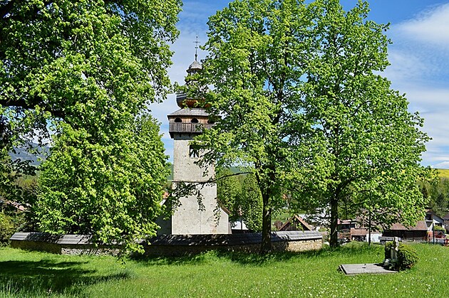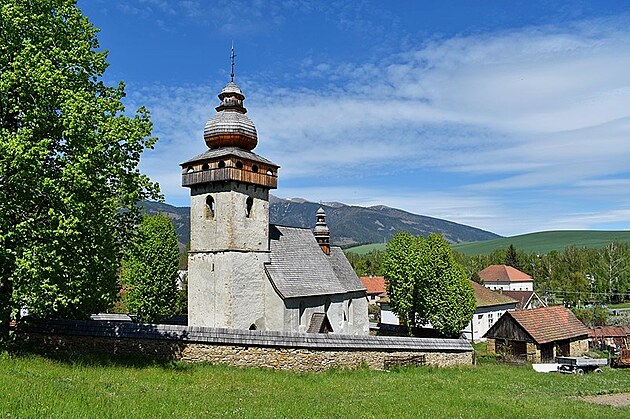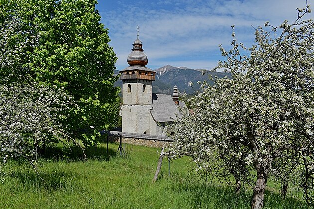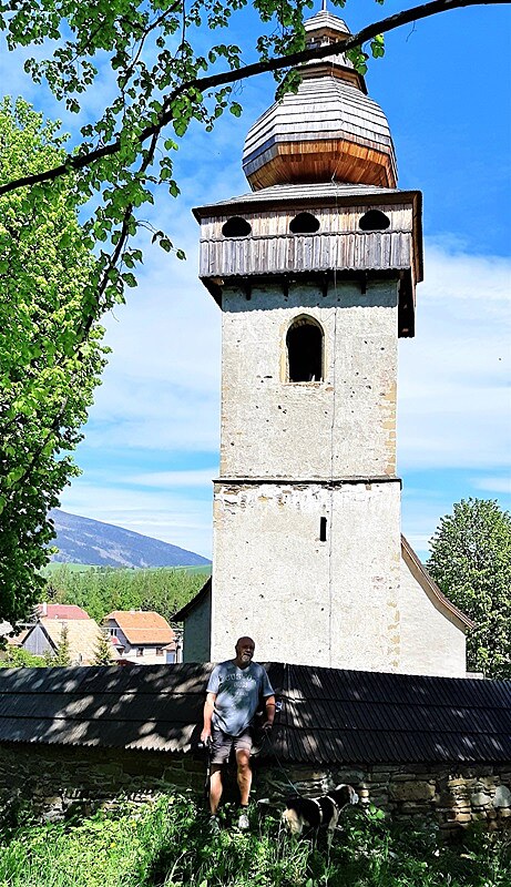 Pred nami, v prvom pláne veža ranogotického kostola Obetovania Pána so šindľovým barokovým zastrešením cibuľového tvaru, vystupuje s celým telom chrámu spoza obranného muru, ako pripomenutie vzácna zachovanej pôvodnosti sakrálnej gotiky v regióne Liptova. Trochu sme sa museli pomknúť raz doľava a potom doprava, aby sme videli celé javisko aj za proscéniom s kostolnou vežou. Aby sme videli celú tú skvostnú pompéznosť mohutného Baníkova a Baranca, ešte s troškou snehu na vrcholoch, vystupujúcich z majestátnosti Západných Tatier.