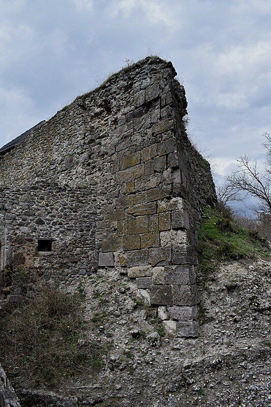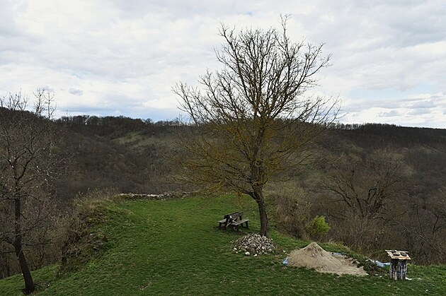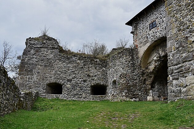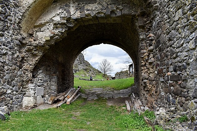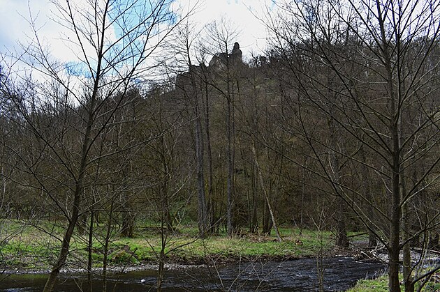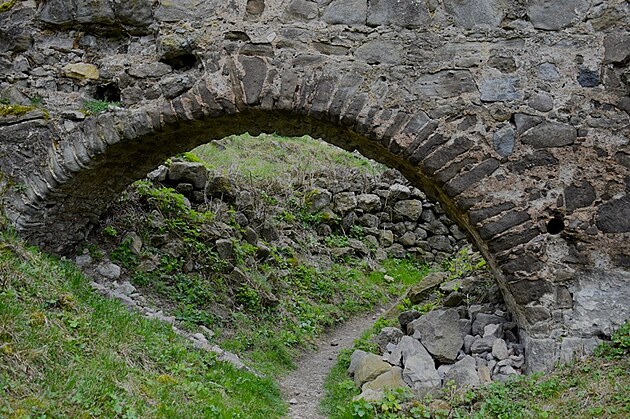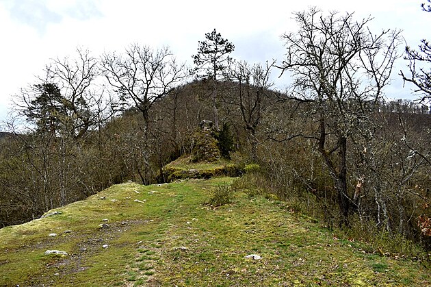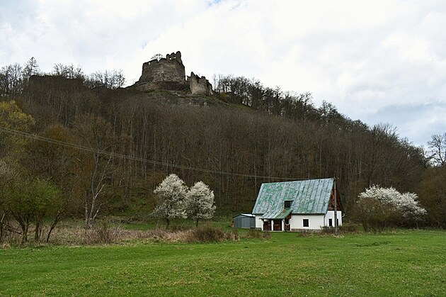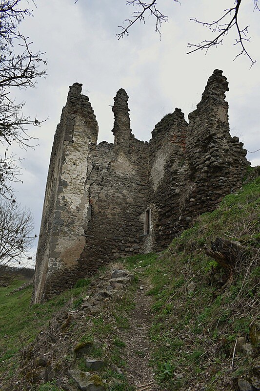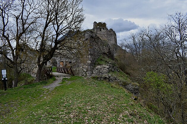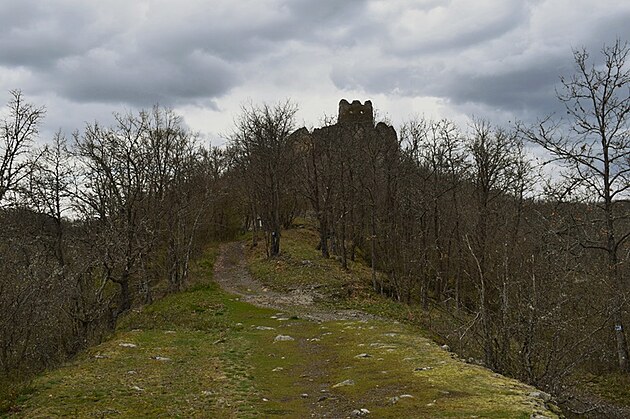 Stúpanie je pomerne mierne, ale v tomto ročnom období mal z toho pochodu väčšiu radosť snáď len náš Áres II. Pobehoval pred nami, sem tam sa obzrel, aby nás nestratil z dohľadu a popohnal nás k cieľu. Jar sa prebúdzala veľmi opatrne, ešte pokrčenými zelenými lístkami na kríkoch a farebným pľúcnikom medzi suchými listami. Keď sme si už hovorili, že oddych by bol asi na mieste, objavila sa niekde medzi konármi stromov silueta hradných múrov. Mysľou mi prebleslo, že to môže byť len akási kulisa, ktorú v diaľke umiestnili zlomyseľní turistolákači, vyškolení na turistomámenie .