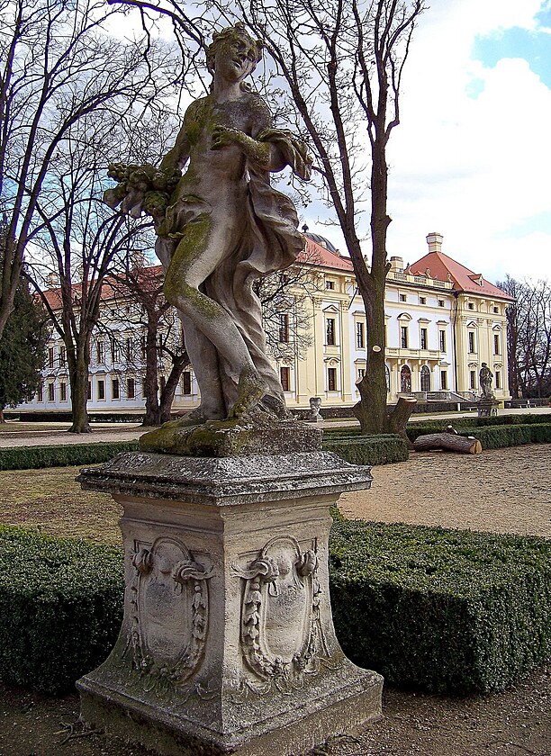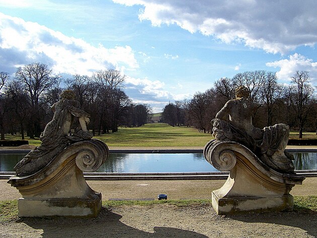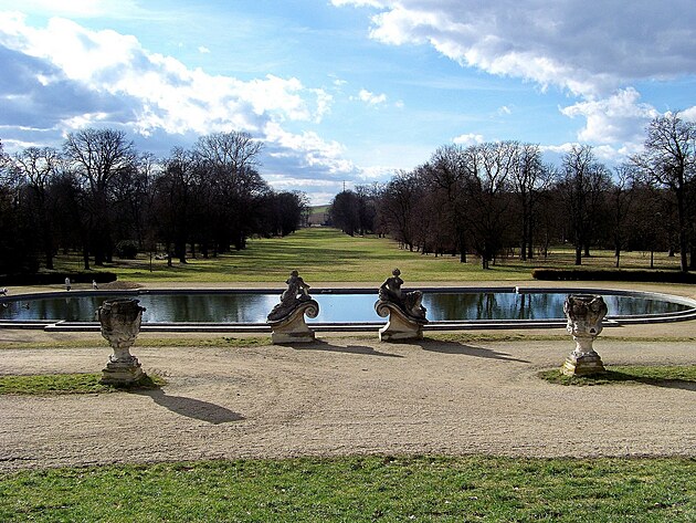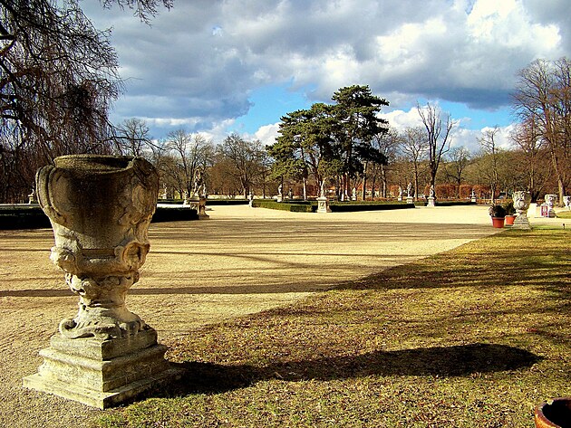 . Medzi sochami extaticky povytáčanými barokom z diaľky parku presvitá zámok a my opäť, ako už toľký raz si hovoríme, že sem musíme ešte prísť v lete, keď tráva bude naozaj zelená, a lístie bude skutočne šumieť a ruže omamne voňať.